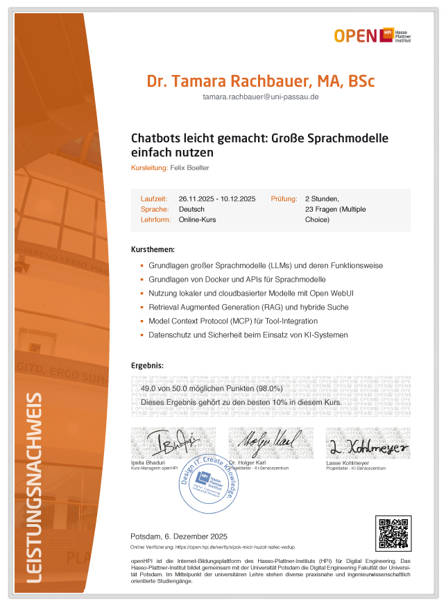 Leistungsnachweis über die Teilnahme am Seminar: Chatbots leicht gemacht: Große Sprachmodelle einfach nutzen am open HPI (026.11.2025-10.12.2025)