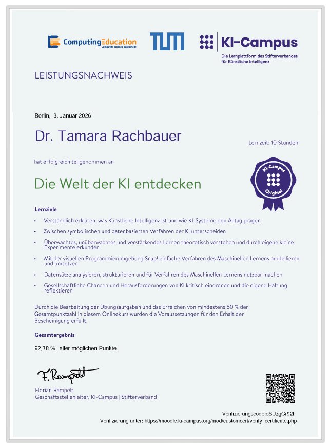 Leistungsnachweis über die Teilnahme am Seminar: Die Welt der KI entdecken am KI-Campus (01.2026)